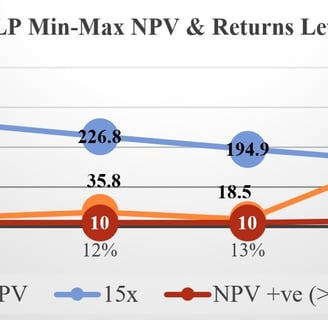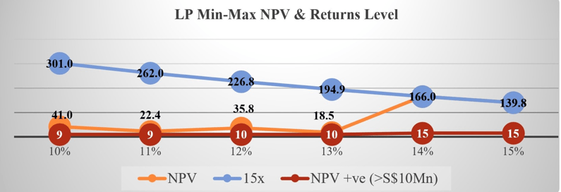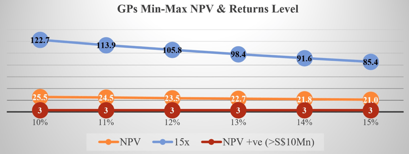 Basically at 10% discount rate above, if ~25% of the invested capital is productive, the LP would end up making between S$41Mn - S$300Mn if the return multiple ranges from 9x to 15x respectively.