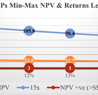 The horizontal base line % represents the discount factor or cost of capital (10%, 11%..15%), red line represents the base minimum returns multiple (7x, 8x and 9x) when the VC firm generates positive Net Present Value >S$10Mn, orange line represents the first positive NPV >S$10Mn at a particular discount rate and return multiple and the blue line represents the NPV at 15x returns multiple at any particular discount rate.